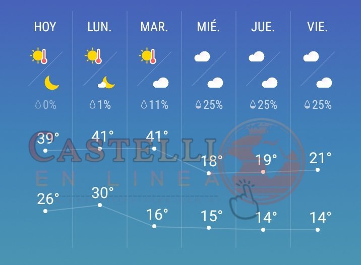 El martes las mÃnimas serán de 28 grados y las máximas de 41 y hay probabilidad de lluvias aisladas durante la noche.