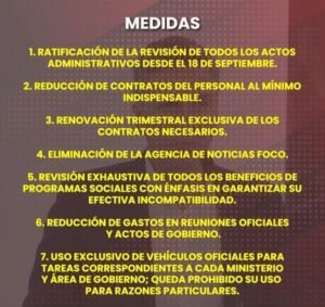 Habrá reducción de contratos al mínimo indispensable, eliminarán la agencia de noticias del Gobierno “Foco”, controlarán el cumplimiento de horarios de trabajo y limitarán compras de mobiliarios, entre las medidas y limitarán el uso de vehículos oficiales.