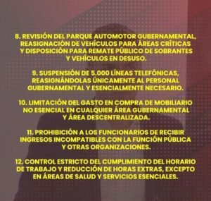 - Suspensión de 5,000 líneas telefónicas, reasignándolas únicamente al personal gubernamental y esencialmente necesario.