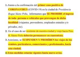 Atento a la confirmación del primer caso positivo de CORONAVIRUS – COVID 19 en la ciudad de Presidencia Roque Saenz Peña :• Informamos que se PROHIBE el Ingreso